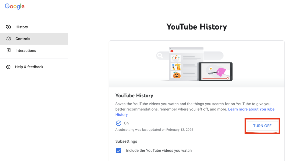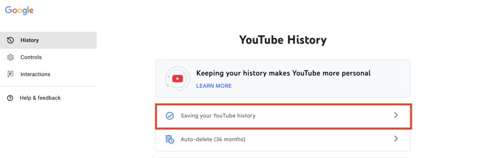 • Click “YouTube is saving your watch history”
